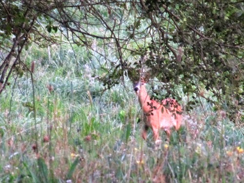 Arrivé sur les lieux à 5h30, j'observe un beau Brocard (chevreuil mâle) qui broute en avançant dans ma direction, jusqu'à une petite dizaine de mètres. Il ne se rendra compte de ma présence que lorsque la voiture de la première participante se fera entendre. Il part alors se mettre à couvert en bondissant et en aboyant.